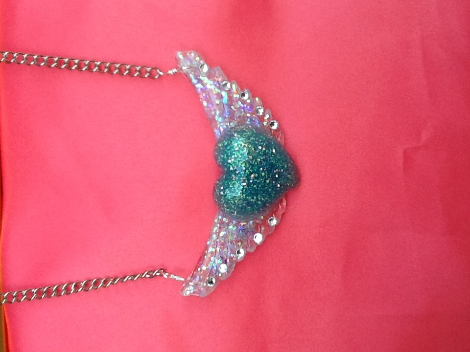 Great with a pair of cowboy boots! Blue heart with angel wings. Measures 4 inches across. Necklace is 18 inches adjustable.