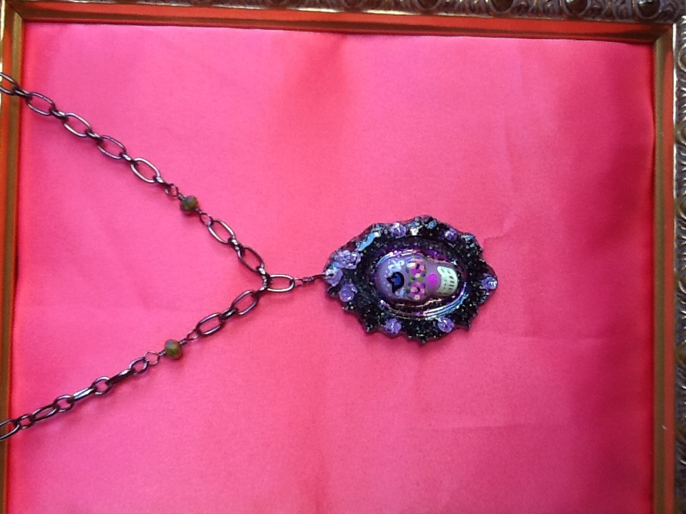 Day of the Dead inspired necklace. Fun statement piece and perfect for Halloween! Measures 18 inches with adjustable clasp.